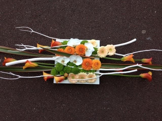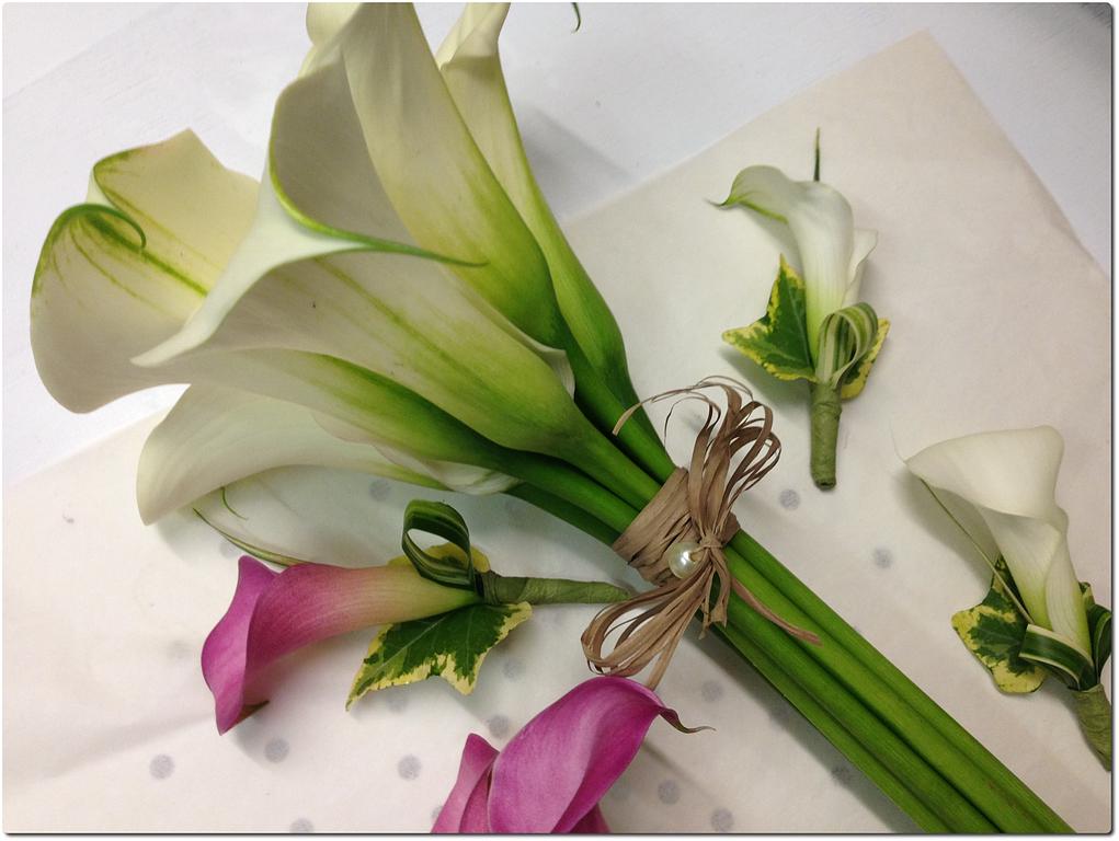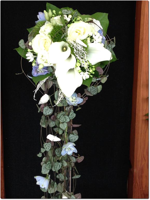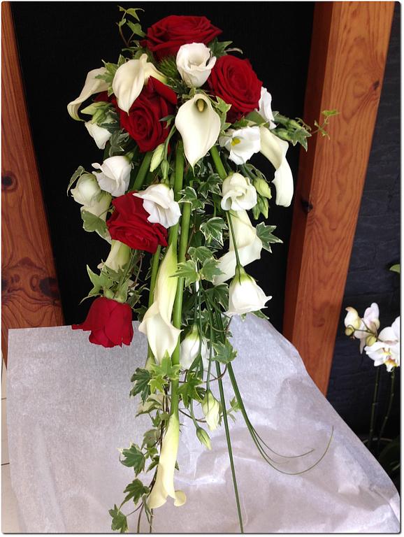Bouquet de mariée retombant, avec de la rose rouge et du calla
