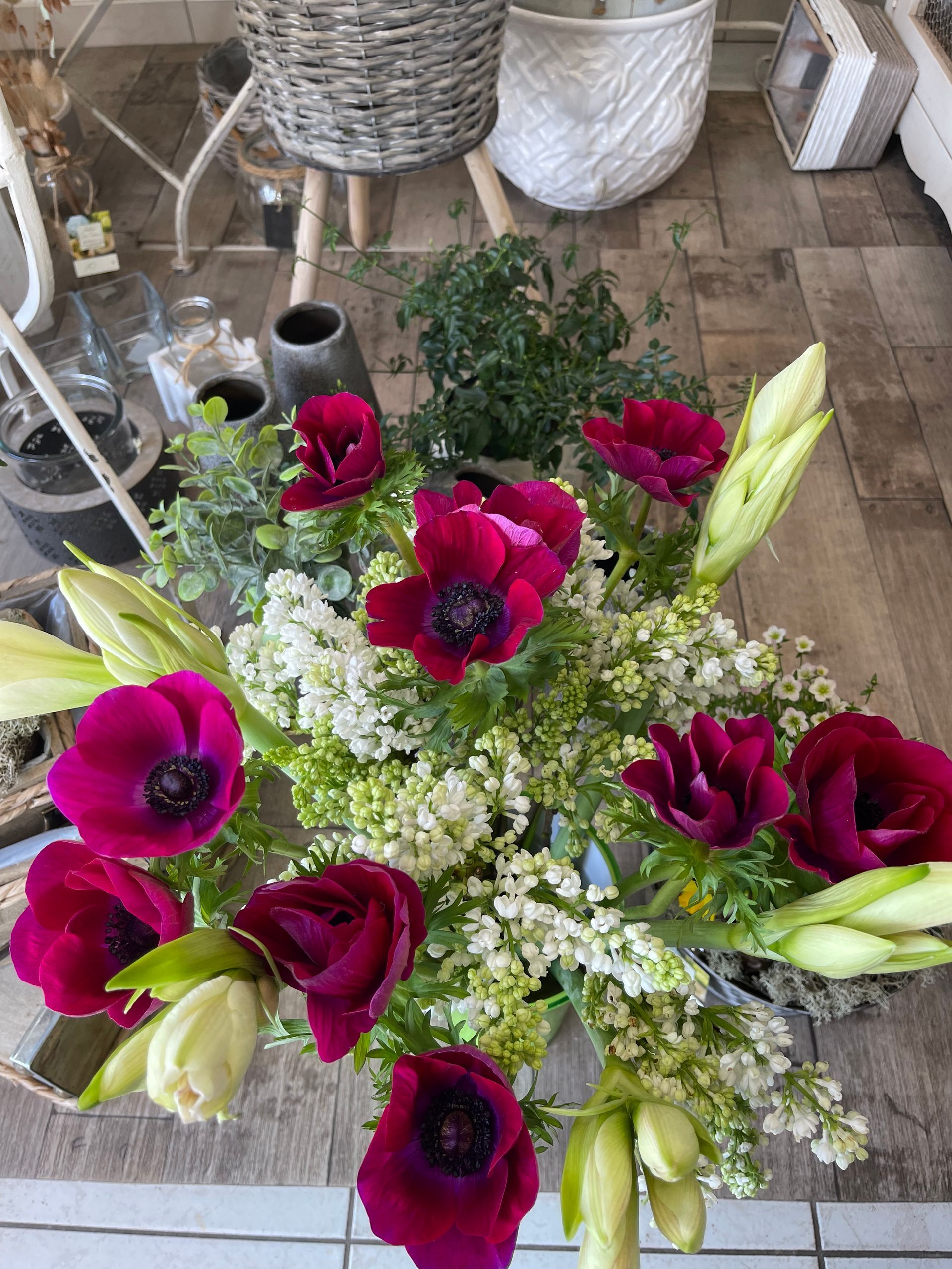 Bouquet de saison d'anémones, amarilys et lilas (disponible en mars)