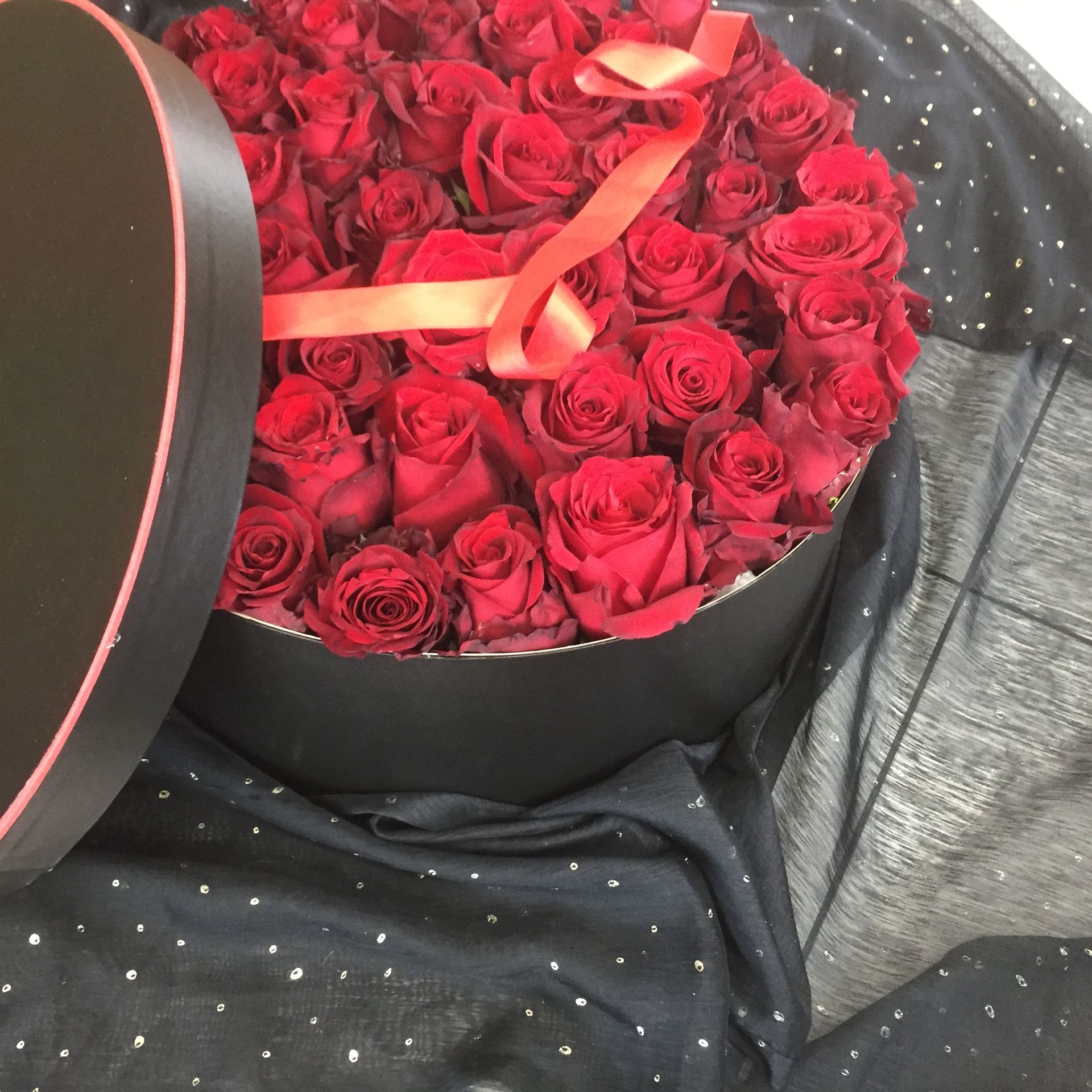 Boite à chapeau de roses rouges idéale pour une demande en mariage (disponible toute l'année sur commande )